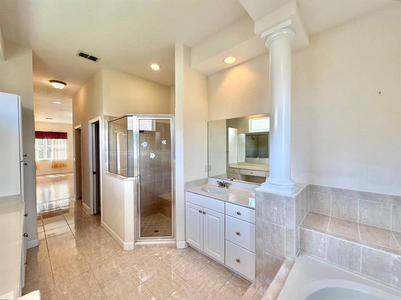 PRICE REDUCED! Welcome home to this bright Torino gem! Long driveway to 2-car garage, front porch perfect for relaxing. Stately entrance w/columns & double glass doors leads to living room w/ hardwood floors. Light-filled enclosed patio opens to living room, primary bedroom & breakfast area. Split bedroom plan, huge laundry w/full-size washer & dryer. Primary suite w/dual closets, private toilet, spa tub & walk-in shower. Spacious kitchen w/natural light, stone counters & stainless appliances. Move-in ready & now even more enticing!First Floor Entry